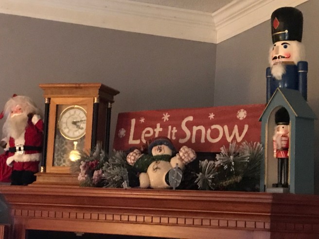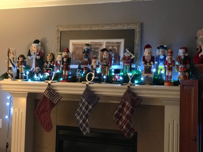 But through all the dread and complaining, I have to say the house looks festive. Fireplace is going, lights on the mantle highlighting the nutcracker invasion, and the tree full of ornaments ranging from our childhood through last year.