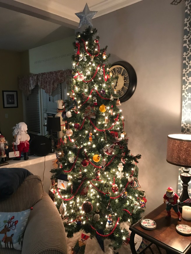 As a kid, I lived for this moment. I drove my folks nuts with wanting to go pull down the big box of Christmas stuff. My job was to sort the limbs of the 1960’s fake tree by the color of paint splotch on the end of each piece. Once done, Mom took over. No lights for fear of catching fire, but all the garland, silver and blue bulb ornaments, and all the tinsel you could stand, painstakingly placed by my Mom. I think my Dad dreaded that day as bad as I do now.